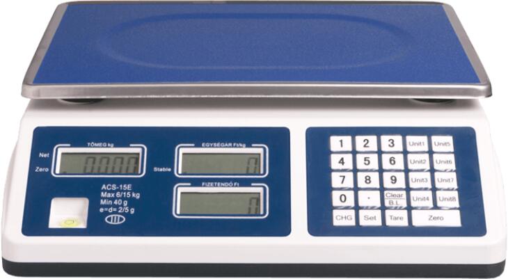 Az árszorzós mérlegek kiválóan alkalmasak élelmiszer boltokba, zöldséges és húsboltokba is, nem csupán egyszerű kezelhetősége, hanem könnyű tisztíthatósága és időtállósága miatt is. Az ACS-30E lapos kialakítású mérleg szabadtéren is jól olvasható vevő- és eladó oldali LCD kijelzővel és könnyedén tisztítható roszdamentes acéltálcával van felszerelve. Beépített akkumulátorának köszönhetően egy feltöltéssel több napig is használható, így utazó és kültéri árusok számára is kiváló választás lehet. Bolti árszorzós mérleg, munkára tervezve Az ACS-A árszorzós mérlegekhez képest az új szériát (ACS-E) már pontosabb mérési tulajdonságok jellemzik, kettős méréshatárának köszönhetően. Míg az előd 10 gramm pontossággal tudott mérni az új ACS-E modellek már 15 kg-ig 5 gramm, felette pedig 10 gramm pontossággal képes erre. Az ACS-15E mérleg külseje és belseje is megújult, billentyűzete és mérőcellája masszívabb kialakítást kapott.